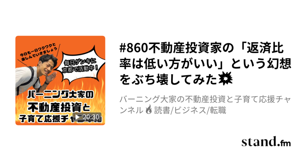 #860不動産投資家の「返済比率は低い方がいい」という幻想をぶち壊してみた💥 - バーニング大家の不動産投資と子育て応援チャンネル🔥読書/ビジネス/転職 | stand.fm