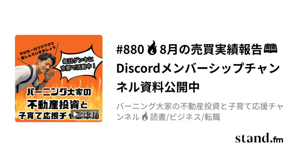 #880🔥8月の売買実績報告📖Discordメンバーシップチャンネル資料公開中 - バーニング大家の不動産投資と子育て応援チャンネル🔥読書/ビジネス/転職 | stand.fm