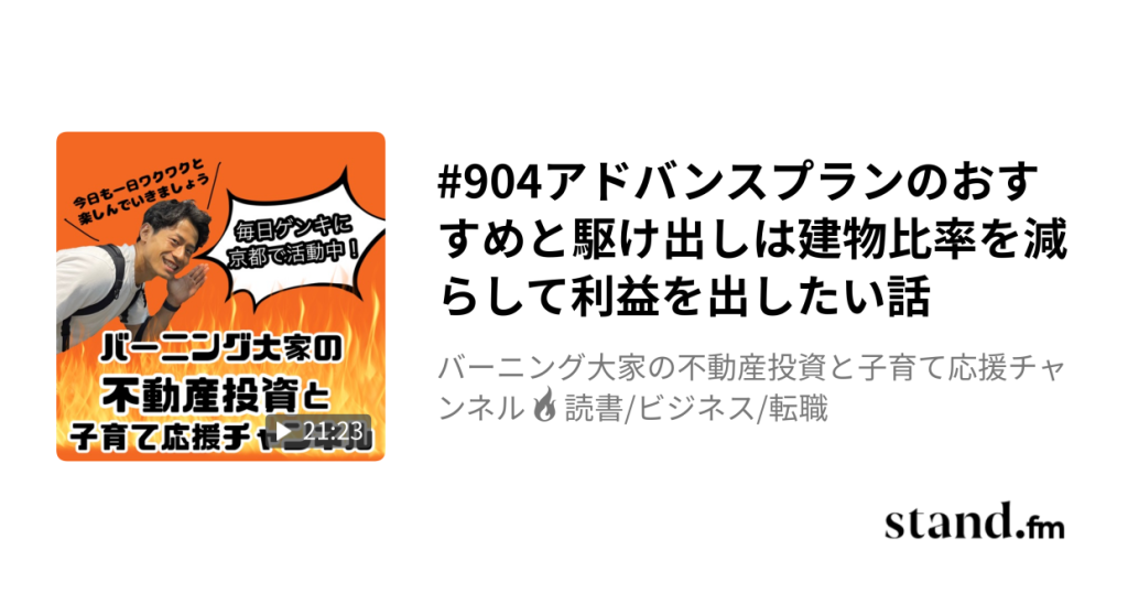 #904アドバンスプランのおすすめと駆け出しは建物比率を減らして利益を出したい話 - バーニング大家の不動産投資と子育て応援チャンネル🔥読書/ビジネス/転職 | stand.fm