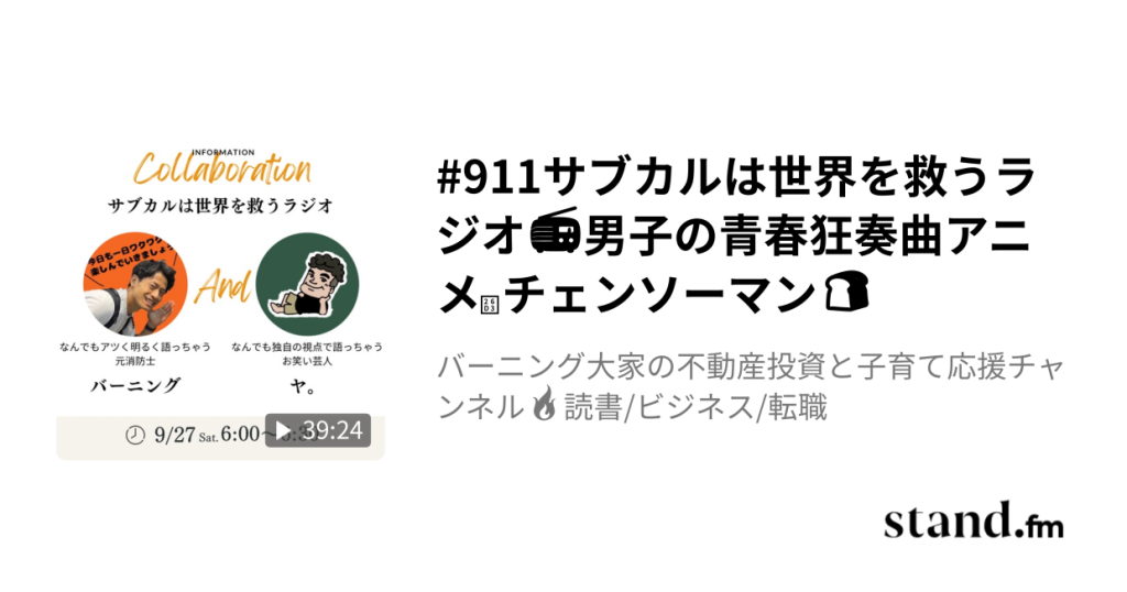 #911サブカルは世界を救うラジオ📻男子の青春狂奏曲アニメ⛓️チェンソーマン🍞 - バーニング大家の不動産投資と子育て応援チャンネル🔥読書/ビジネス/転職 | stand.fm