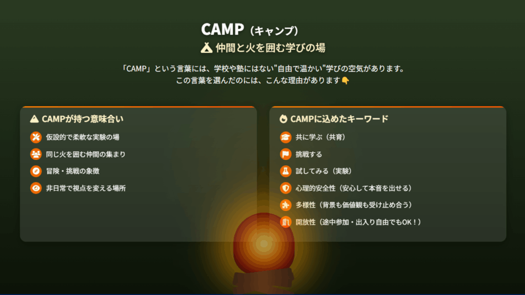 そんな自由で温かい学びの空間をCAMPという言葉に込めました。