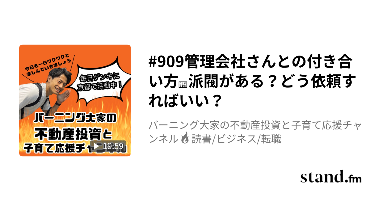 スタエフことstand.fmでは元消防士、現不動産事業家のバーニング大家が、ワクワクして生きよう!をテーマに、大家業や子育ての日常を、毎日元気に音声で発信していきます! 毎朝6時30分の更新です。