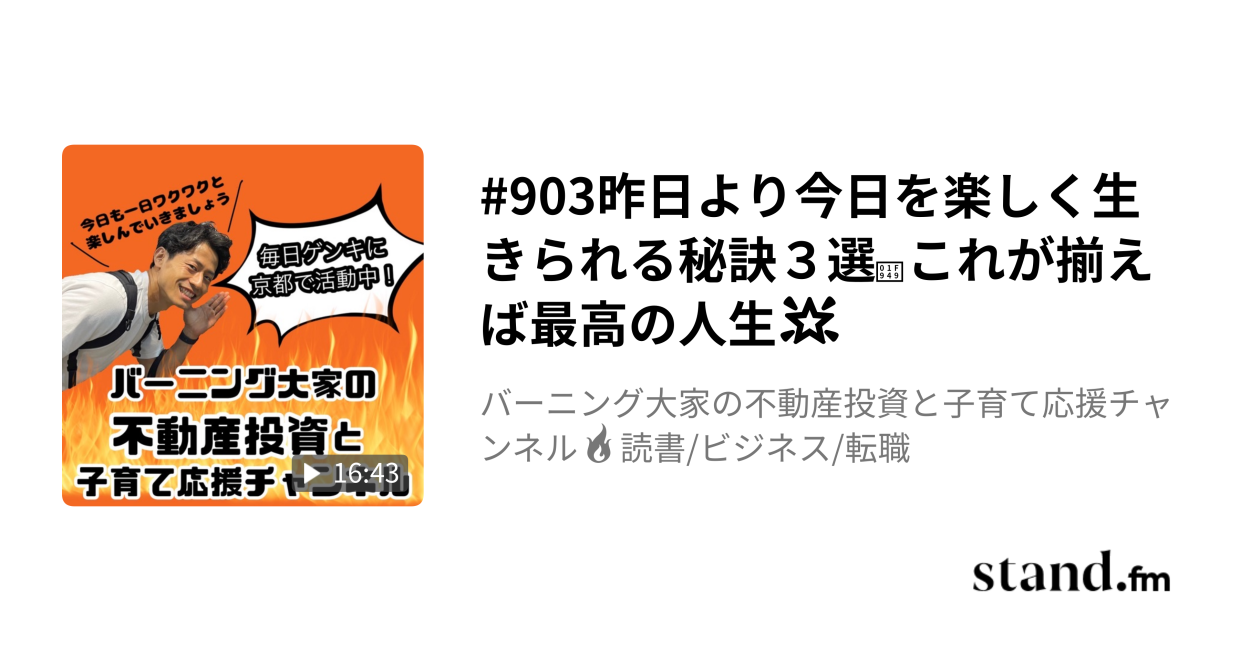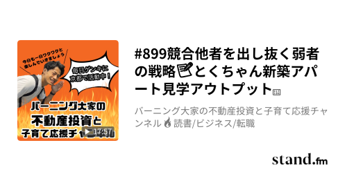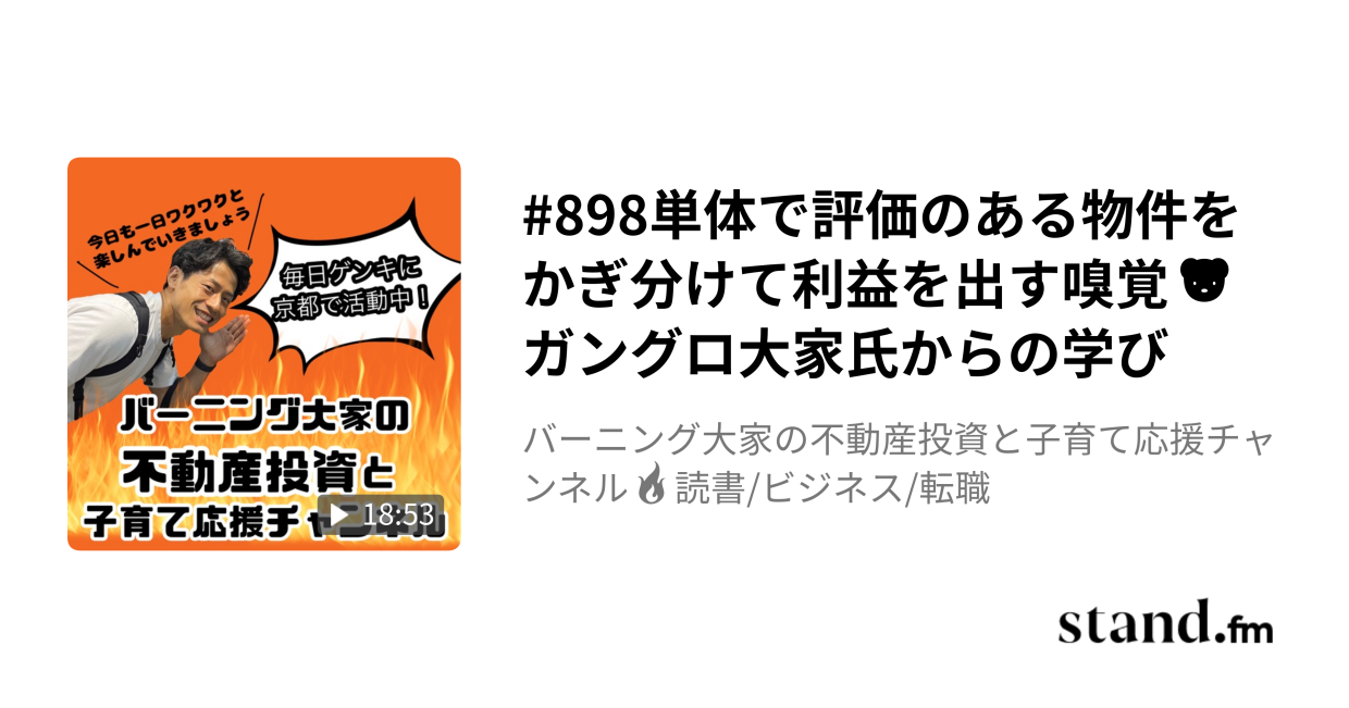 スタエフことstand.fmでは元消防士、現不動産事業家のバーニング大家が、ワクワクして生きよう!をテーマに、大家業や子育ての日常を、毎日元気に音声で発信していきます! 毎朝6時30分の更新です。