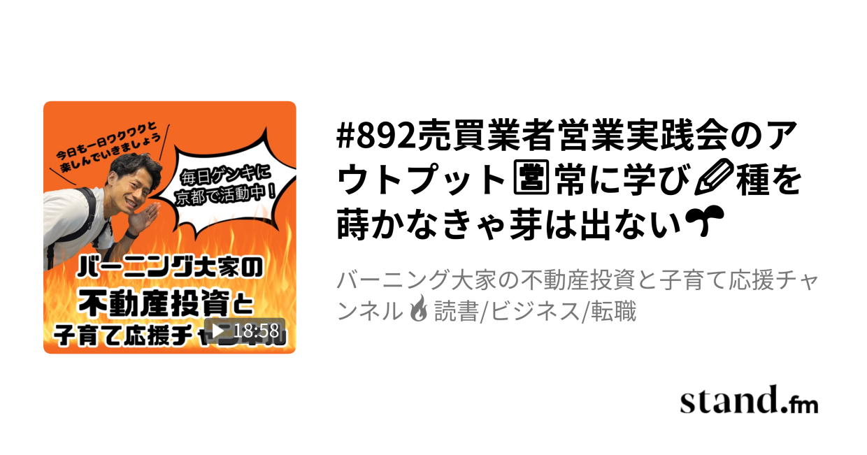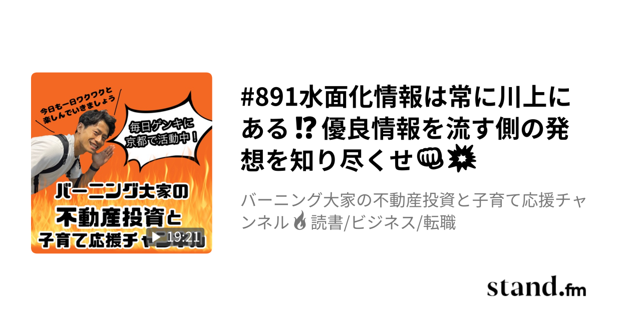 スタエフことstand.fmでは元消防士、現不動産事業家のバーニング大家が、ワクワクして生きよう!をテーマに、大家業や子育ての日常を、毎日元気に音声で発信していきます! 毎朝6時30分の更新です。