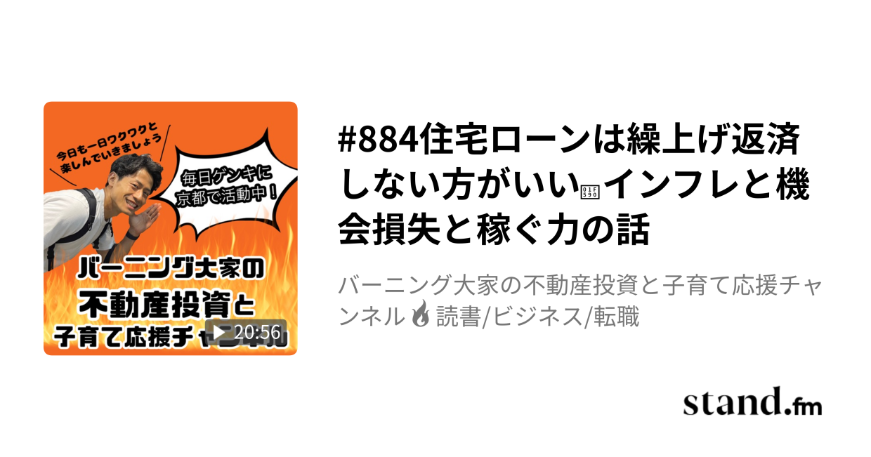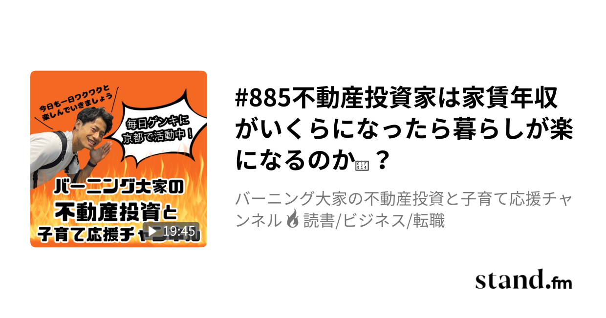 スタエフことstand.fmでは元消防士、現不動産事業家のバーニング大家が、ワクワクして生きよう!をテーマに、大家業や子育ての日常を、毎日元気に音声で発信していきます! 毎朝6時30分の更新です。